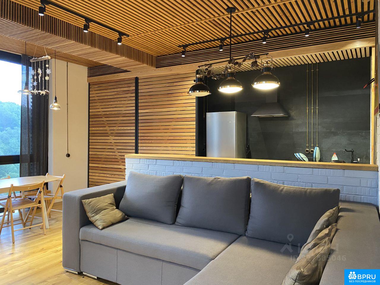 Дизайнерская квартира в стиле лофт с отделкой из экологичных материалов: паркет дуб, стеновые панели из тика, перегородки из кирпича, реечный деревянный потолок, панорамные окна, качественная сантехника. Оснащена всем необходимым. Закрытая территория с бассейном и детскими площадками, с набережной и видом на лес. на территории есть парковка, кафе, аптека, остановка общественного транспорта, магазин.