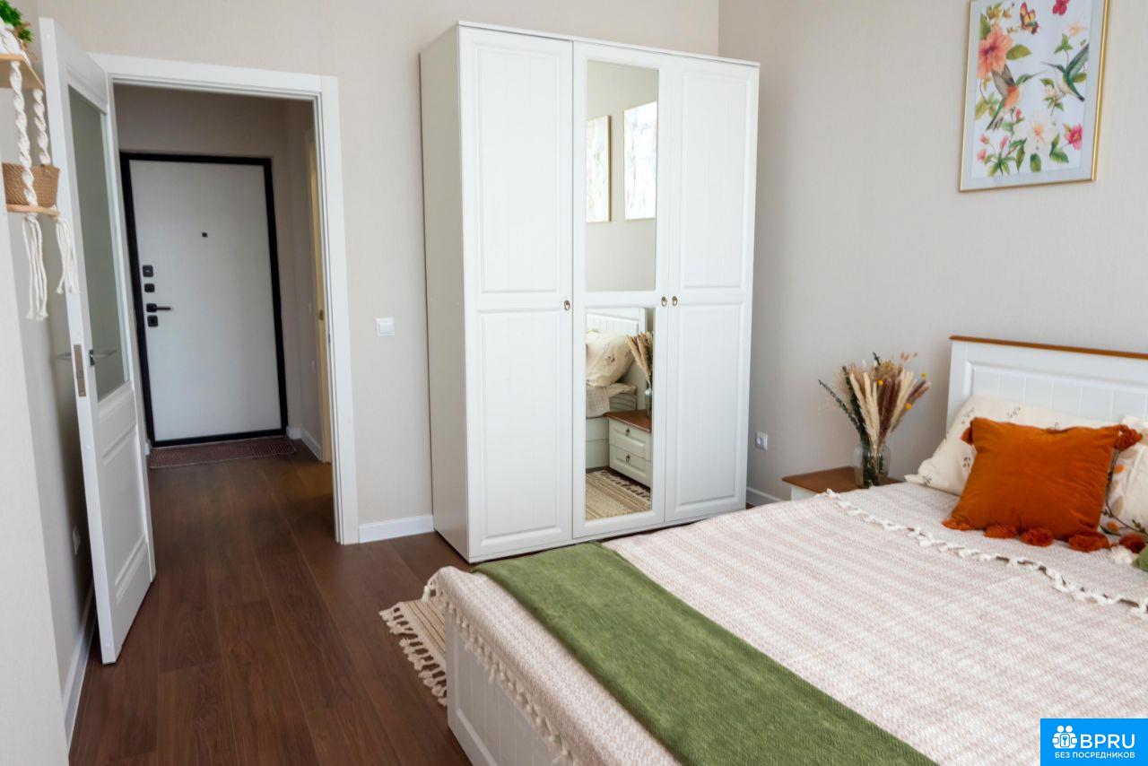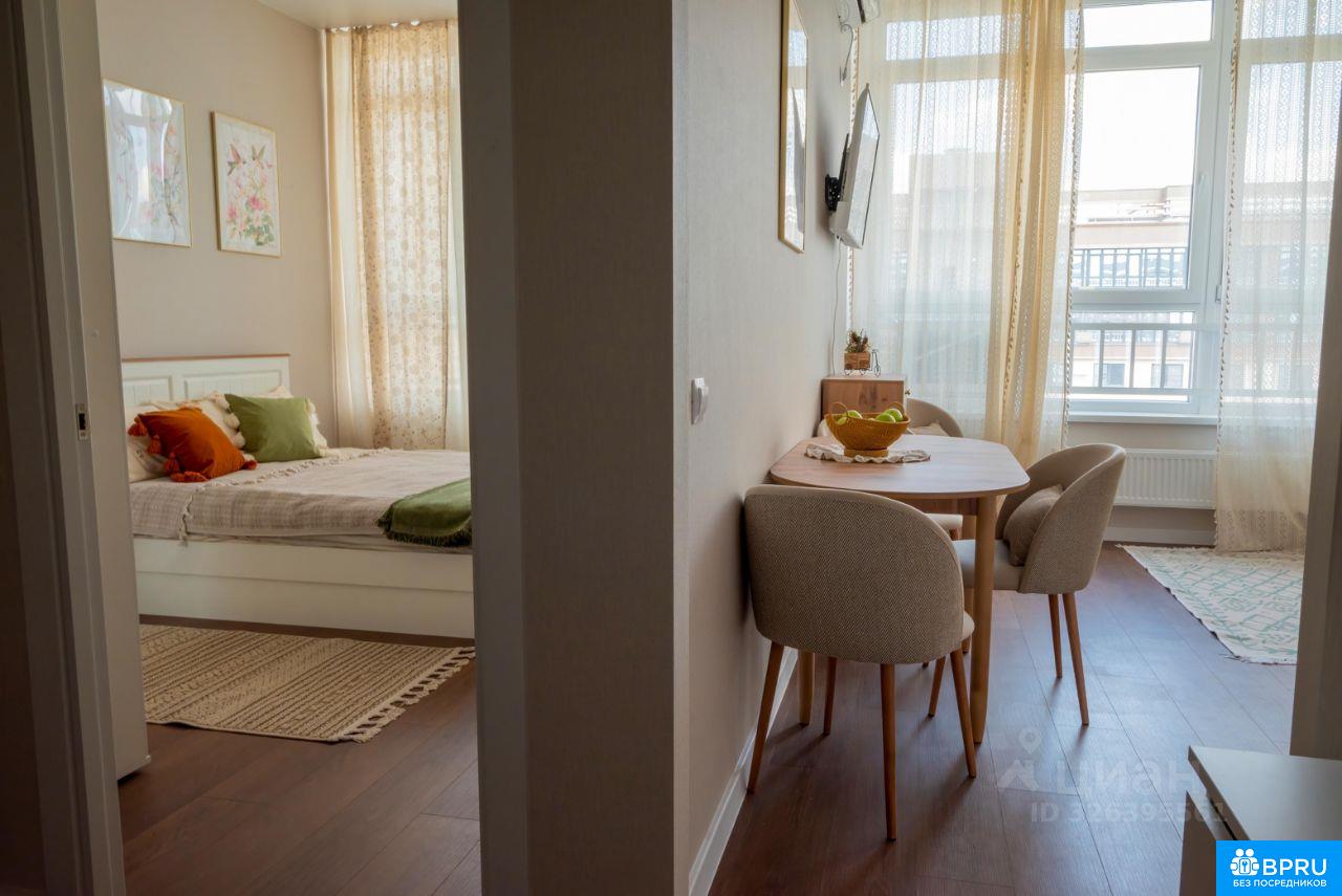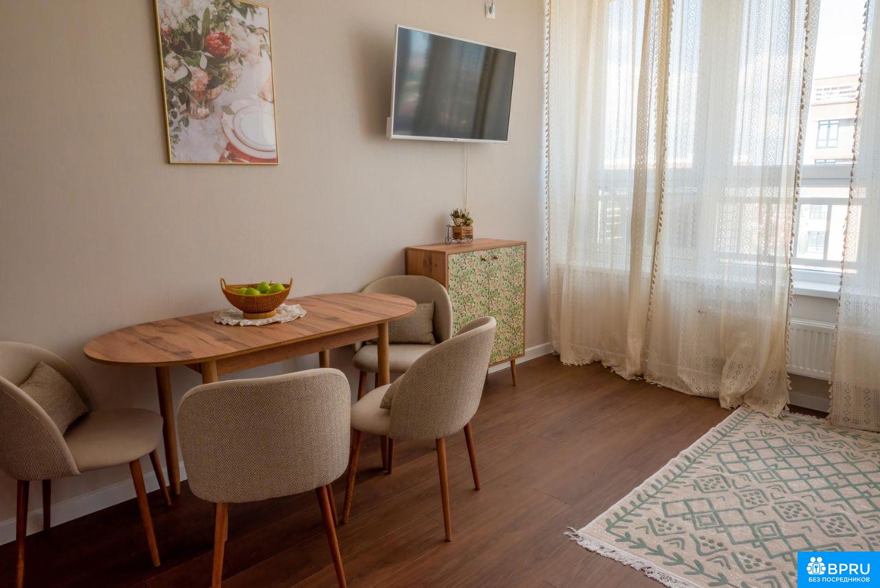 ПРОСЬБА РИЕЛТОРОВ НЕ БЕСПОКОИТЬ! Сдаётся светлая, просторная квартира на 15 этаже. Панорамные окна во всю стену (в кухне и спальне). В квартире выполнен евро ремонт, мебель вся новая. Просторная кухня площадью 18 м² оснащена всем необходимым: холодильник, плита, микроволновая печь, духовой шкаф, чайник, базовый набор посуды. В кухне-гостиной установлен кондиционер. В комнате имеется вместительный шкаф и удобная кровать (все новое). Санузел совмещённый, оформлен в современном стиле. В прихожей предусмотрены удобные шкафы для хранения вещей. Дом оборудован пассажирским и грузовым лифтами, а также открытой парковкой во дворе. В подъезде чисто и ухоженно. В пешей доступности продуктовые магазины, ПВЗ известных маркетплейсов, школа и остановка общественного транспорта. Курение в квартире не допускается. Проживание с детьми и животными обсуждается индивидуально.