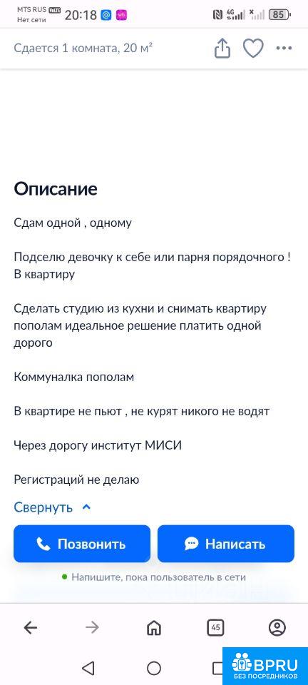 Сдам комнату одному , одной платежеспособной На длительный срок от года В квартире не пьют , не курят , ни кого не водят. Проживание с хозяйкой. Коммуналка пополам Через дорогу институт МИСИ Регистрации не делаю