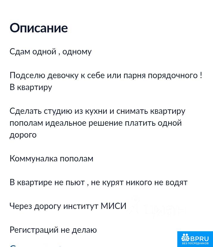 Сдам большую комнату одному , одной платежеспособной Без вредных привычек. Агентов не беспокоить На длительный срок от года Все необходимое для проживания имеется. Холодильник, стиральная машинка, плитка, новая микроволновая печь, новая кровать с ортопедическим матрасом. Развитая инфраструктура Рядом фитнес клуб, круглосуточные магазины. В квартире не пьют , не курят , ни кого не водят. Проживание с хозяйкой. Регистрация НЕВОЗМОЖНА(даже временная). Коммуналка свет , вода пополам Через дорогу институт МИСИ В квартире спокойная тихая кошка