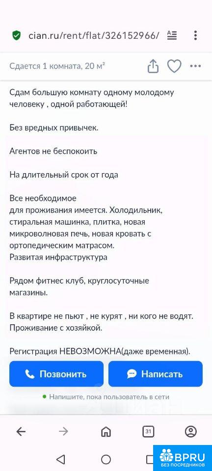 Сдам большую просторную светлую комнату одному молодому человеку , одной работающей девушке. Агентов не беспокоить На длительный срок от года Без вредных привычек Все необходимое для проживания имеется. Холодильник , новая микроволновка, стиральная машина, новая кухня , новая ванная комната новая огромная кровать с ортопедическим матрасом. Развитая инфраструктура. В квартире не пьют , не курят , никого не водят Проживание с работающей хозяйкой. Рядом фитнес клуб , круглосуточные магазины , остановка общественного транспорта. И жд Лосиноостровская. 2 минуты ходьбы Регистрация невозможно. Даже временно. Строго со своей регистрацией. Коммуналка- свет , вода пополам. через дорогу институт МИСИ В квартире тихая спокойная кошка.
