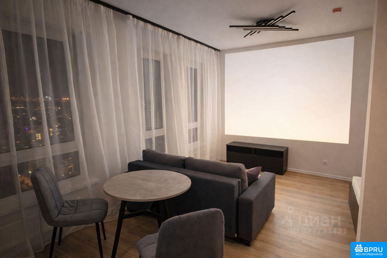 Однокомнатная квартира в современном стиле. Высокий этаж, панорамный вид. Много воздуха, вечером особенно атмосферно. В гостиной проектор. СВЧ, чайник, плита, гладильная доска, стиральная машина, холодильник. на длительный срок. Залог. Без комиссий.
