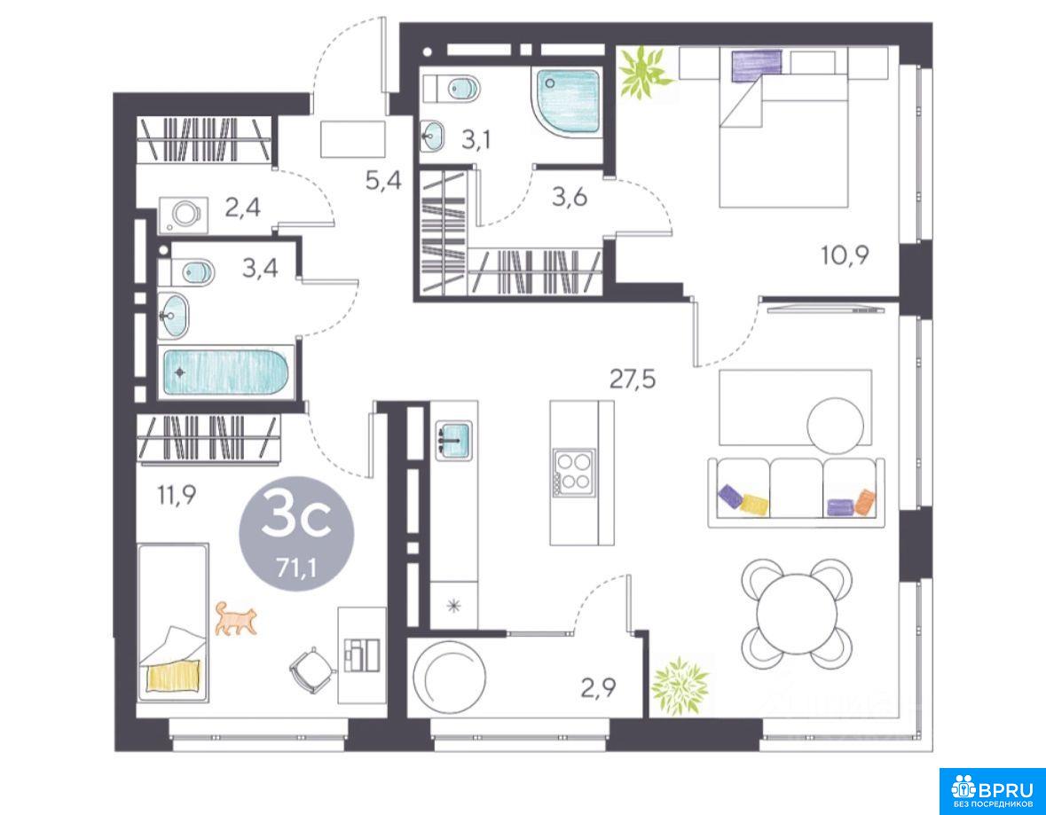 3-к квартира, 68,3 кв.м