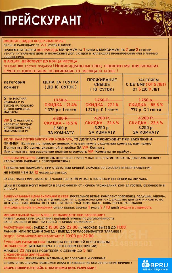 НЕ ХОСТЕЛ( МАКС. МЕСТ 5 + 3 доп )КОР.-ДЛИТ. СРОК. РАБ. В2В. ЮР и ФИЗ. ЛИЦАМИ. ЦЕНЫ В ПРАЙСЕ . Рассматриваем варианты сотрудничества для совместного развития % Есть варианты под ваши цели и бюджет. Возможна Врем. регистрация, только проживающим гостям ! По России бывают проблемы связи, если вы не дозвонились, пишите мы оперативно ответим. АНАЛОГИЧНОГО ФОРМАТА ПРЕДЛОЖЕНИЙ В ГОРОДЕ ВЫ НЕ НАЙДЕТЕ ! Проект Комфорт 10 ориентирован и создан для гостей, которым необходим комфорт и доп. услуги сервиса включенные в проживание по оптимальному соотношению цена / качество! ПОСМОТРИТЕ НАШ ВИДЕООБЗОР в объявление. Настройте качество изображения и ракурс положения в видеоплеере. ОБРАТИТЕ ВНИМАНИЕ : НАШ ОБЪЕКТ НЕ ЯВЛЯЕТСЯ ХОСТЕЛОМ И НЕ ПРЕДОСТАВЛЯЕТ УСЛУГ ХОСТЕЛА . БОНИРУЕТСЯ ВСЯ КВАРТИРА , и в период вашего проживания она будет занята только вами. Свободные комнаты закрываются. КАК ЗАБРОНИРОВАТЬ И УСЛОВИЯ СМОТРИТЕ НИЖЕ _ДОП._УСЛУГИ_ВКЛЮЧЕНЫЕ В СТОИМОСТЬ ПРОЖИВАНИЯ И ТАК ЖЕ МЫ ПРЕДОСТАВЛЯЕМ : Комплекты постельного белья и полотенец Средства гигиены, кухонные и ванные принадлежности, Фен, утюг и гладильная доска,Велком-набор чай, кофе и другое. Бесплатный Wi-Fi После каждого выезда гостей постельное белье и полотенца стираются и гладятся в проф. прачечной, проводим уборку, проветривание и дезинфекцию поверхностей. ПРИ ДЛИТЕЛЬНОМ ПРОЖИВАНИЕ уборка, смена белья и полотенец предоставляются КАЖДЫЕ_ 7 10_ дней ВКЛЮЧЕНЫ В СТОИМОСТЬ. Ортопедические матрасы и качественные кровати. Все места оборудованы и есть все необходимое для комфортного проживания ! МАКС. Количество Мест : в общей комнате ОСНОВНЫХ_ 4 мест + 1 доп. полноценное место + 2 _ отдельная Двухместная_ VIP-Комната. + 1 _ Место ВЫКАТНАЯ КРОВАТЬ ВРЕМЯНКА . Комната оснащена замком . _______КАК ЗАБРОНИРОВАТЬ Вы по прайсу выбираете комнаты, цены на последнем фото или календаре бронирования. • 1. Пишите нам в личные сообщения указав даты количество суток, количество гостей, желаемые комнаты, категория группы семья или организация, возраст и гражданство, и мы оперативно рассчитаем стоимость вашего проживания с учетом возможных скидок. • 2. Или воспользуйтесь календарём бронирования. Стоимость с учетом скидок отобразиться после заполнения всех данных. НО ОБРАТИТЕ ВНИМАНИЯ ! ЧТО В КАЛЕНДАРЕ БРОНИРОВАНИЯ МОЖНО ОПЛАТИТЬ ТОЛЬКО ОСНОВНУЮ КОМНАТУ _ 4_ +_ 1 _ ПОЛНОЦЕННОЕ ДОП. МЕСТО ! За Доп. VIP-КОМНАТУ ОПЛАТА Отдельно ! Оплата производится ЗА КАЖДОГО гостя После согласования вы можете оплачивать удобным для вас способом. ЦЕНЫ В ПРАЙСЕ Предварительные сморите на последнем ФОТО .Возможны доп. скидки ! Размещаем на Сутки, Месяц и Более. Заявки принимаем МИНИМУМ. за_ 1 _сутки, МАКСИМУМ ЗА 2 или 3 недели до приезда . Отдел бронирования работает С _ 10:00_ До _ 22:00 _по_Москве_. ЗАЕЗД. С_ 15:00 _ДО_ 22:00 _ВЫЕЗД. ДО _ 11:00 • ОБЪЕКТ ПОД ОХРАНОЙ , что обеспечивает вашу безопасность, конфиденциальность гарантированна.