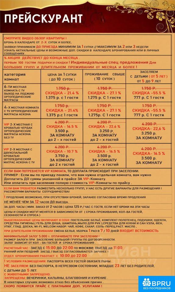 НЕ ХОСТЕЛ( МАКС. МЕСТ 10 + 4 доп )КОР.-ДЛИТ. СРОК. РАБ. В2В. ЮР и ФИЗ. ЛИЦАМИ. ЦЕНЫ В ПРАЙСЕ . Размещаем на Сутки, Месяц и Более. Рассматриваем варианты сотрудничества для совместного развития % Есть варианты под ваши цели и бюджет. Врем. регистрация,но только проживающим гостям ! По России бывают проблемы связи, если вы не дозвонились, пишите мы оперативно ответим. АНАЛОГИЧНОГО ФОРМАТА ПРЕДЛОЖЕНИЙ В ГОРОДЕ ВЫ НЕ НАЙДЕТЕ ! Проект Комфорт 10 ориентирован и создан для гостей, которым необходим комфорт и доп. услуги сервиса включенные в проживание по оптимальному соотношению цена / качество! ПОСМОТРИТЕ НАШ ВИДЕООБЗОР в объявление. Настройте качество изображения и ракурс положения в видеоплеере. ОБРАТИТЕ ВНИМАНИЕ : НАШ ОБЪЕКТ НЕ ЯВЛЯЕТСЯ ХОСТЕЛОМ И НЕ ПРЕДОСТАВЛЯЕТ УСЛУГ ХОСТЕЛА . БОНИРУЕТСЯ ВСЯ КВАРТИРА , и в период вашего проживания она будет занята только вами. Свободные комнаты закрываются. КАК ЗАБРОНИРОВАТЬ И УСЛОВИЯ СМОТРИТЕ НИЖЕ _ДОП._УСЛУГИ_ВКЛЮЧЕНЫЕ В СТОИМОСТЬ ПРОЖИВАНИЯ И ТАК ЖЕ МЫ ПРЕДОСТАВЛЯЕМ : Комплекты постельного белья и полотенец Средства гигиены, кухонные и ванные принадлежности, Фен, утюг и гладильная доска,Велком-набор чай, кофе и другое. Бесплатный Wi-Fi После каждого выезда гостей постельное белье и полотенца стираются и гладятся в проф. прачечной, проводим уборку, проветривание и дезинфекцию поверхностей. ПРИ ДЛИТЕЛЬНОМ ПРОЖИВАНИЕ уборка, смена белья и полотенец предоставляются КАЖДЫЕ_ 7 10_ дней ВКЛЮЧЕНЫ В СТОИМОСТЬ. Все 4 комнаты отдельные и оснащены замками. Ортопедические матрасы и качественные кровати. Все места оборудованы и есть все необходимое для комфортного проживания ! МАКС. Количество Мест : В 6 мест. и 4 мест. ОСНОВНЫХ_ 8 мест + 2 доп. полноценное места И + 4 места в_Двухместных_ Доп. VIP-Комнатах с премиальными Аскона матрасами !В одной комнате двуспальная кровать 200 / 140 и 55 дюймовый Андройд TV 4к _______ КАК ЗАБРОНИРОВАТЬ Вы по прайсу выбираете комнаты, цены на последнем фото или календаре бронирования. • 1. Пишите нам в личные сообщения указав даты количество суток, количество гостей, желаемые комнаты, категория группы семья или организация, возраст и гражданство, и мы оперативно рассчитаем стоимость вашего проживания с учетом возможных скидок. • 2. Или воспользуйтесь календарём бронирования. Стоимость с учетом скидок отобразиться после заполнения всех данных. НО ОБРАТИТЕ ВНИМАНИЯ ! ЧТО В КАЛЕНДАРЕ БРОНИРОВАНИЯ МОЖНО ОПЛАТИТЬ ТОЛЬКО ОСНОВНЫЕ КОМНАТЫ _ 8_ +_ 2 _ ПОЛНОЦЕННОЕ ДОП. МЕСТО ! За Доп. VIP-КОМНАТЫ ОПЛАТА Отдельно ! Оплата производится ЗА КАЖДОГО гостя. После согласования вы можете оплачивать удобным для вас способом. ЦЕНЫ УСЛОВИЯ В ПРАЙСЕ Предварительные сморите на последнем ФОТО .Возможны доп. скидки ! Бронь за_ 1 _ сутки до приезда. Отдел бронирования работает С _ 10:00_ До _ 22:00 _по_Москве_. ЗАЕЗД. С_ 15:00 _ДО_ 22:00 _ВЫЕЗД. ДО _ 11:00 Объект по охраной. Конфиденциальность .