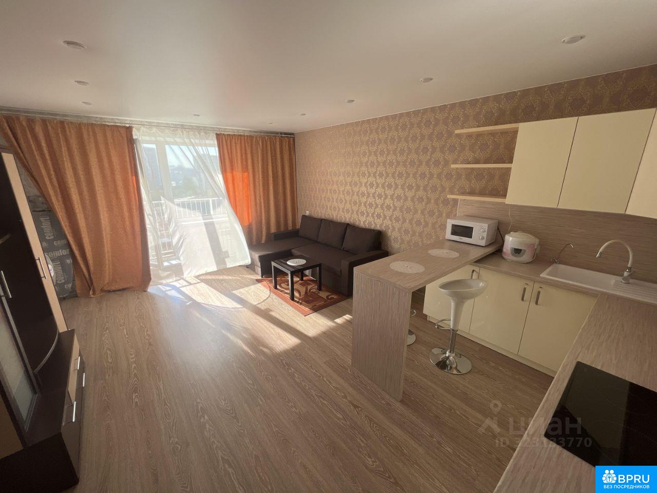Уютная квартира-студия. Есть вся необходимая мебель и техника. Удобный выезд из двора. Хорошие соседи. Окна выходят на частный сектор, нет шума с улицы