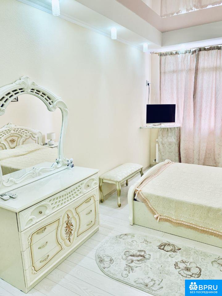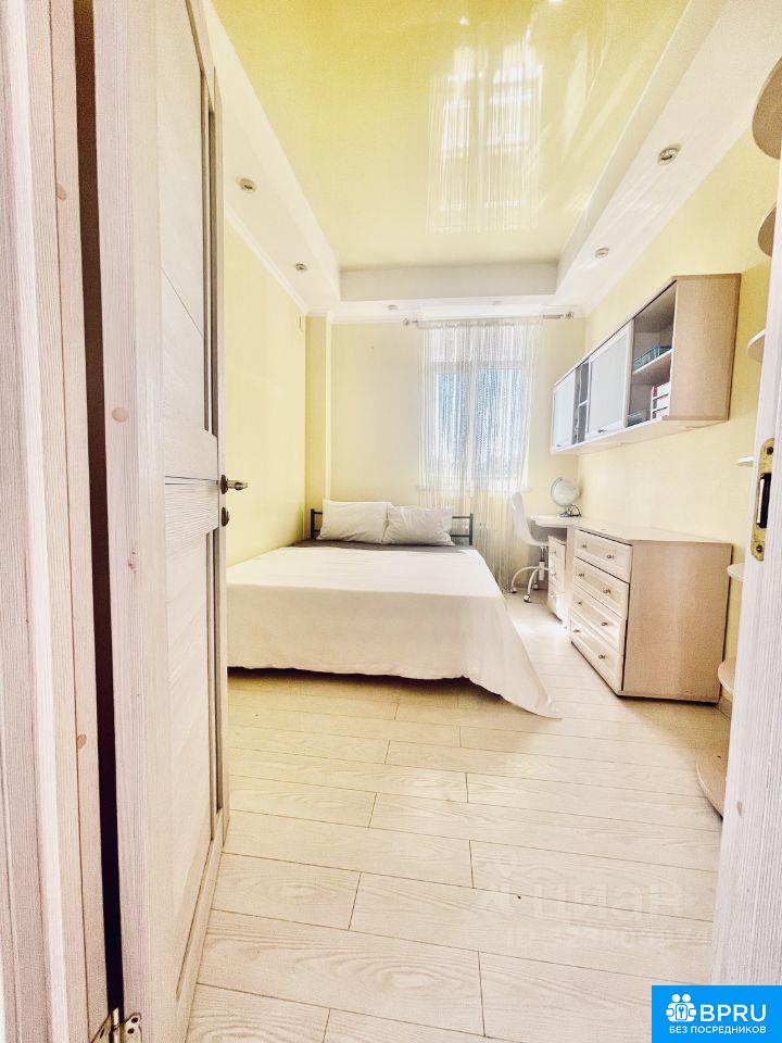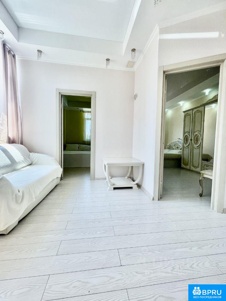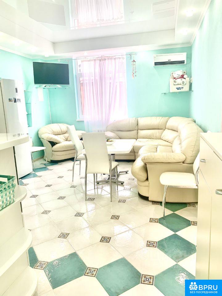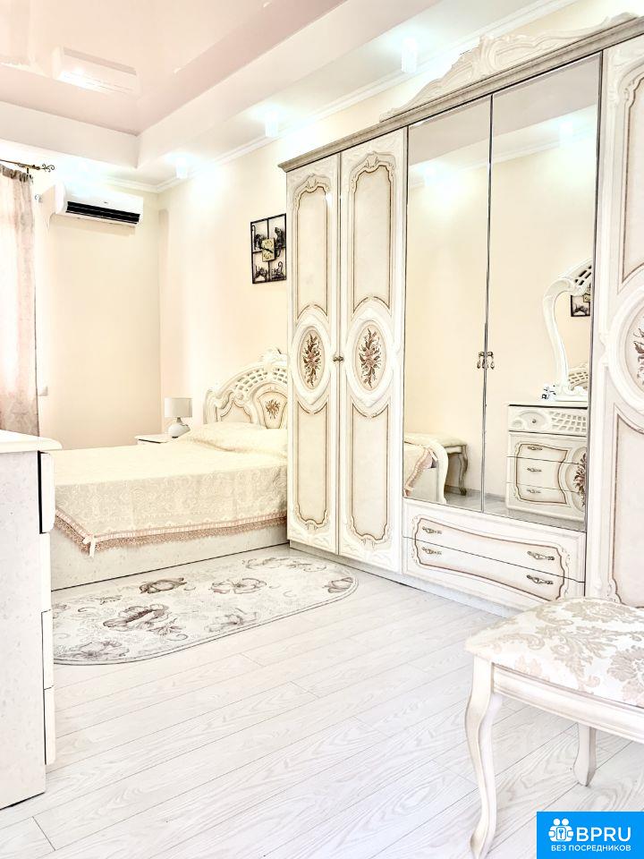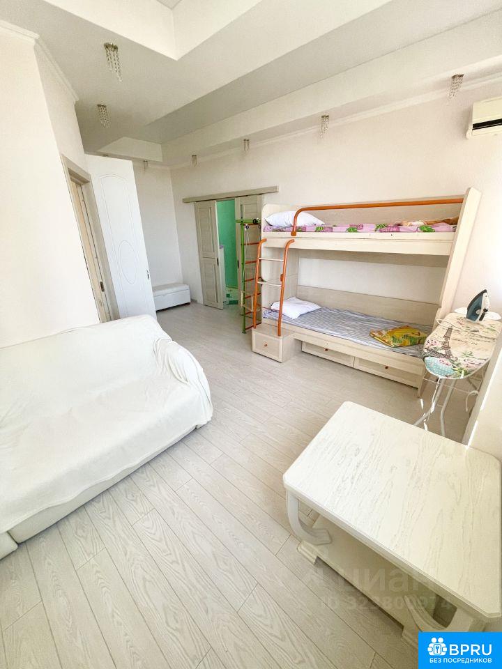 Большая, светлая квартира. Две изолированные спальни. Первая изолированная спальня с двуспальной кроватью,. Вторая изолированная спальня с двуспальной кроватью. Проходная комната с двухъярусной кроватью. Кухня совмещена с залом с большим диваном(раскладывается). Есть все необходимое. Дом бизнес класса, консьерж. Своя придомовая территория, детская площадка. Море в шаговой доступности по ровной дороге. Вид из окна на море есть. Балкон. В доме на против магазин Магнит. Рядом автобусная остановка. На районе есть крытый бассейн, аквапарк. Фото соответствует действительности. Можно на несколько месяц(меньше месяцев дороже цена). Длительная аренда без выселения на лето 75000+коммуналка. Подробности по телефону.