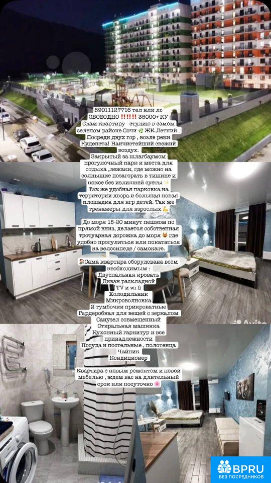 СВОБОДНО 35000+ КУ Сдам квартиру - студию в самом зеленом районе Сочи ЖК Летний . Посреди двух гор , возле реки Кудепста! Наичистейший свежий воздух. Закрытый за шлагбаумом прогулочный парк и места для отдыха ,лежаки, где можно на солнышке позагорать в тишине и покое без излишней суеты Так же удобная парковка на территории двора и большая новая площадка для игр детей. Так же тренажеры для взрослых До моря 15-20 минут пешком по прямой вниз, делается собственная тротуарная дорожка до моря где удобно прогуляться или покататься на велосипеде / самокате. Сама квартира оборудована всем необходимым : Двуспальная кровать Диван раскладной TV и wi fi Холодильник Микроволновка 2 тумбочки прикроватные Гардеробная для вещей с зеркалом Санузел совмещенный Стиральная машинка Кухонный гарнитур и все принадлежности Посуда и постельные , полотенца Чайник Кондиционер Квартира с новым ремонтом и новой мебелью , ждем вас на длительный срок или посуточно