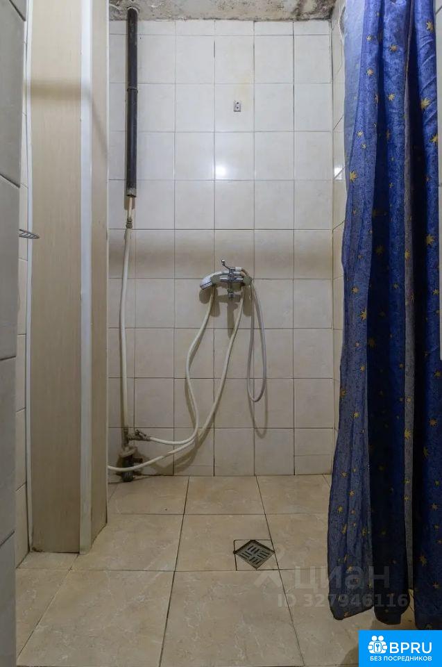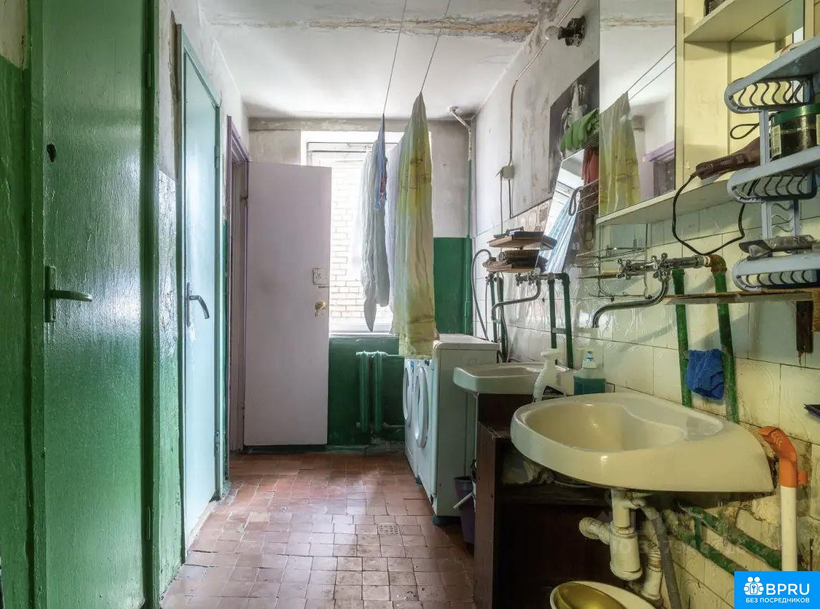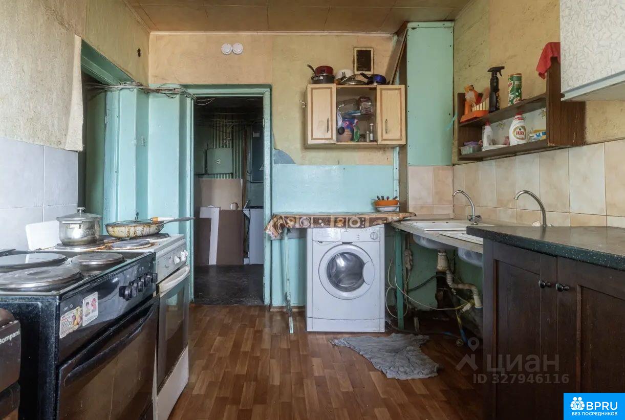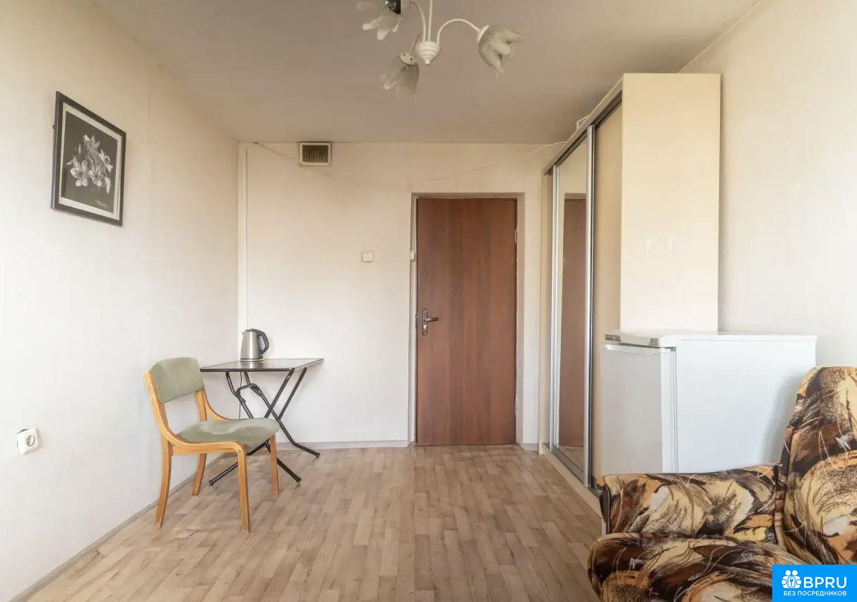 Комната в бывшем общежитии. Свое место на кухне, стол, стиральная машинка. В комнате: стол, диван, холодильник.